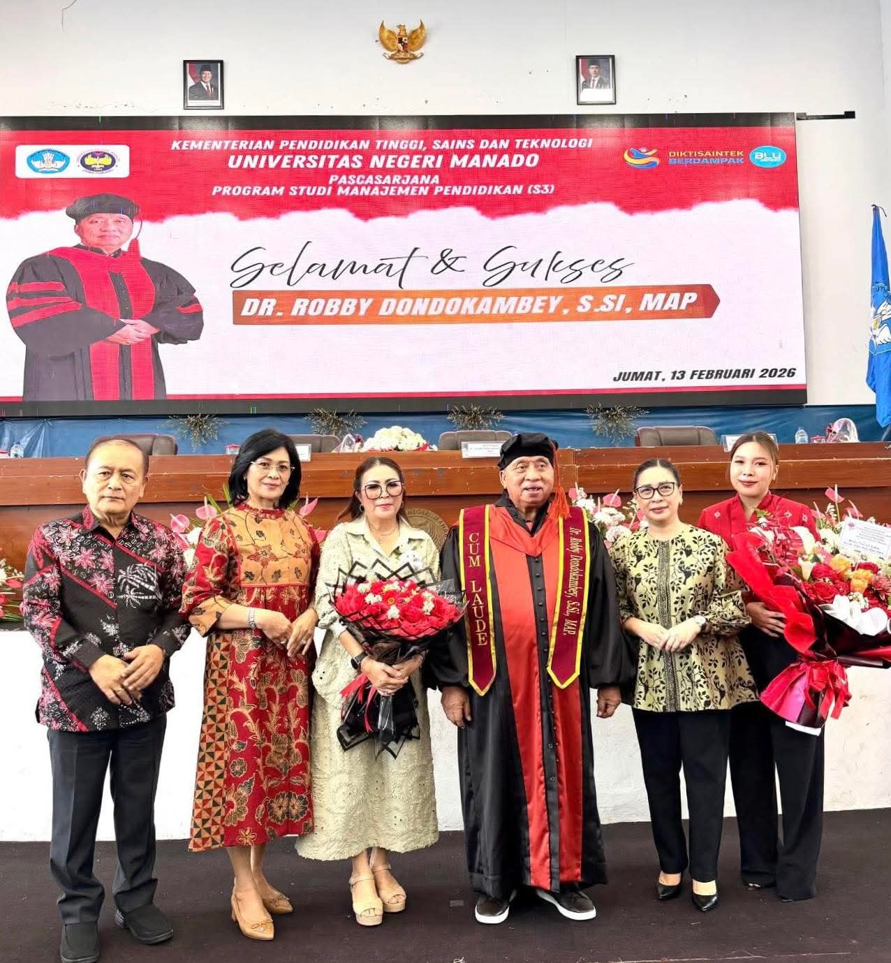 Edisibacirita – Prestasi akademik membanggakan kembali ditorehkan oleh Robby Dondokambey. Pada Jumat, 13 Februari 2026, ia sukses menjalani Ujian Promosi Doktor Program Studi Manajemen Pendidikan (S3) dan dinyatakan lulus dengan predikat Cumlaude.