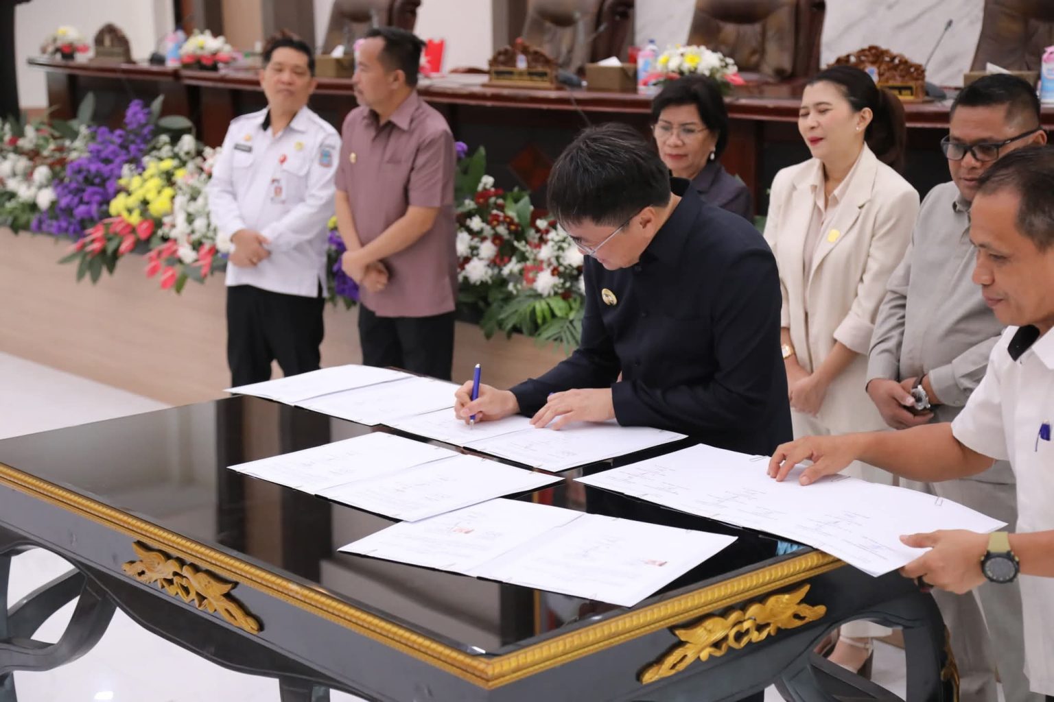 Acara dilanjutkan dengan Penandatanganan Nota Kesepakatan Terhadap Rancangan Perubahan KUA PPAS APBD Kota Manado Tahun Anggaran 2025 oleh Ketua dan Para Wakil Ketua DPRD serta Wali Kota Manado.