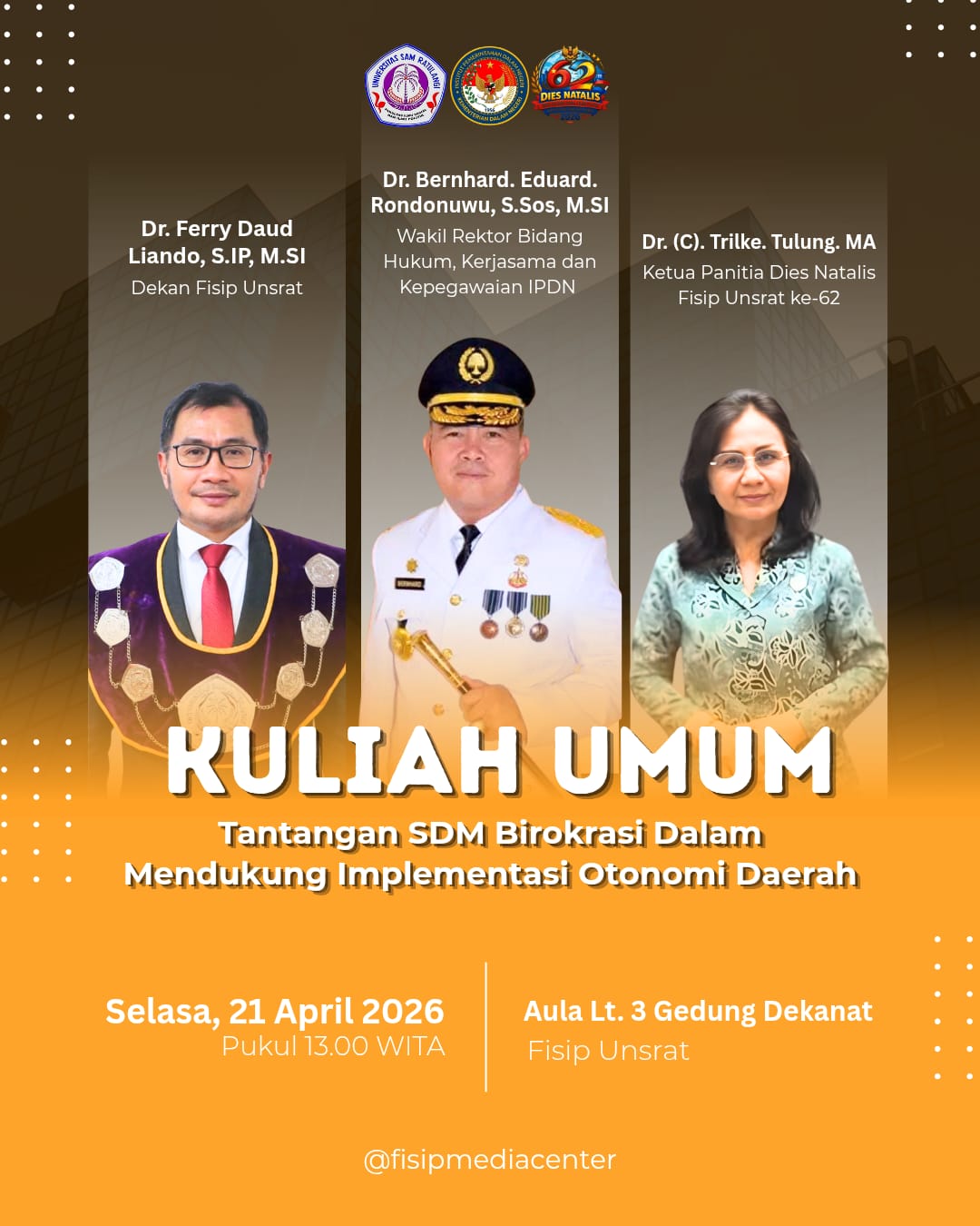 Kegiatan ini dijadwalkan berlangsung pada Selasa, 21 April 2026, pukul 13.00 WITA, bertepatan dengan peringatan Hari Otonomi Daerah. Kuliah umum tersebut akan dibuka oleh Dekan FISIP Unsrat, Ferry Daud Liando.
