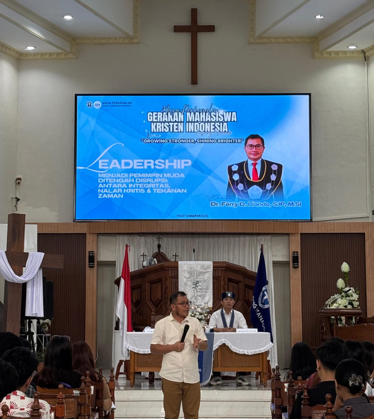 Edisibacirita — Dekan FISIP Unsrat sekaligus senior GMKI, Ferry Daud Liando, membawakan materi kepemimpinan (leadership) pada hari kedua Masa Perkenalan (Maper) GMKI Cabang Manado, Sabtu (18/4/2026), di GMIM Bethesda Ranotana.