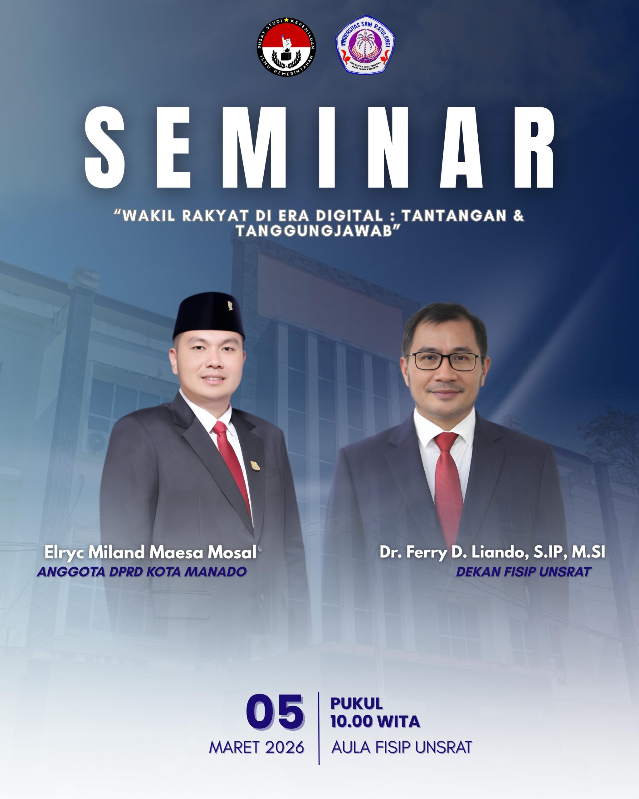 FISIP – Anggota DPRD Kota Manado, Elryc Miland Maesa Mosal, dijadwalkan menjadi pembicara dalam seminar bertajuk “Wakil Rakyat di Era Digital: Tantangan & Tanggung Jawab” yang akan digelar pada Kamis, 5 Maret 2026, pukul 10.00 WITA, di Aula FISIP Unsrat.