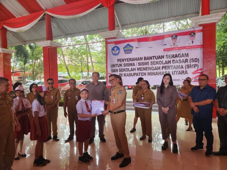 MINAHASA UTARA – Komitmen Pemerintah Kabupaten (Pemkab) Minahasa Utara (Minut) dalam menunjang dan meningkatkan kualitas pendidikan, terus direalisasikan dan dibuktikan dengan membagikan bantuan seragam sekolah bagi para pelajar tingkat SD dan SMP.