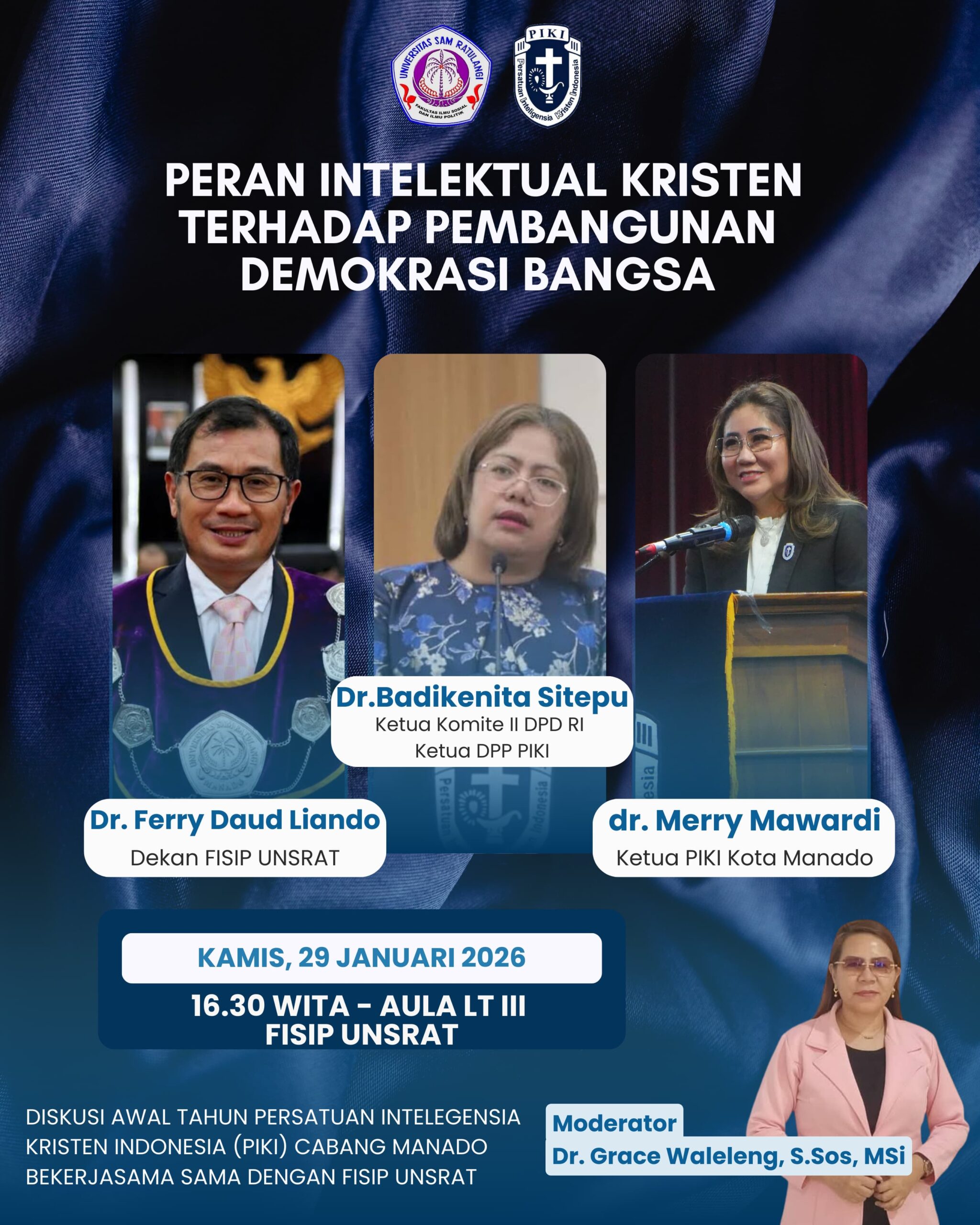 Manado — Perhimpunan Intelegensia Kristen Indonesia (PIKI) Kota Manado bekerja sama dengan Fakultas Ilmu Sosial dan Ilmu Politik (FISIP) Universitas Sam Ratulangi (Unsrat) menggelar diskusi awal tahun bertema “Peran Intelektual Kristen terhadap Kualitas Demokrasi”, bertempat di FISIP Unsrat, Kamis (29/01/2026).