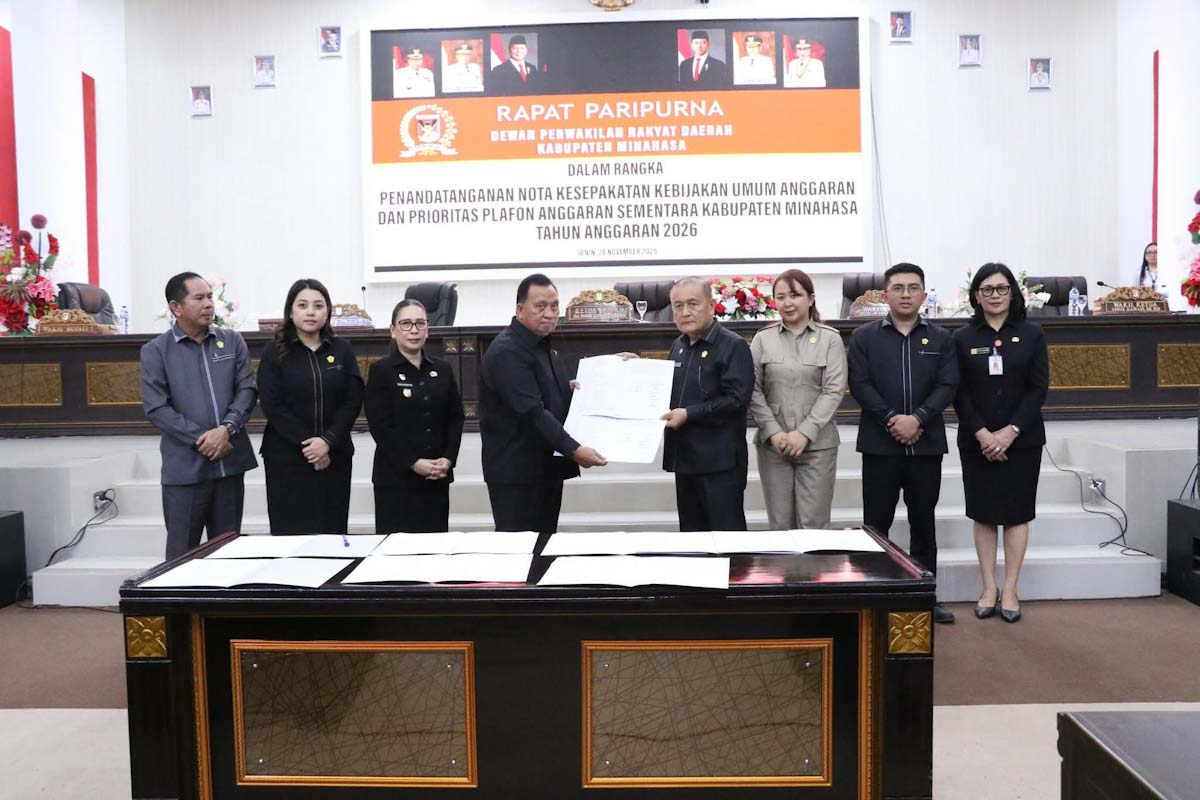 DPRD Kabupaten Minahasa dan Pemkab Minahasa akhirnya menandatangani Nota Kesepakatan Kebijakan Umum Anggaran (KUA) serta Prioritas Plafon Anggaran Sementara (PPAS) APBD Tahun Anggaran 2026.