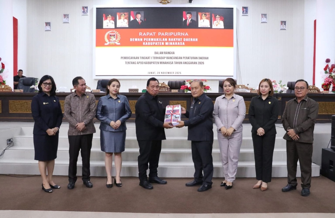 DPRD Kabupaten Minahasa menggelar Rapat Paripurna Tingkat I pembahasan Rancangan APBD Tahun Anggaran 2026, Jumat (28/11/2025) di Ruang Sidang DPRD. Rapat dipimpin Ketua DPRD Robby Longkutoy bersama para wakil ketua, dan dihadiri 28 dari 35 anggota dewan.