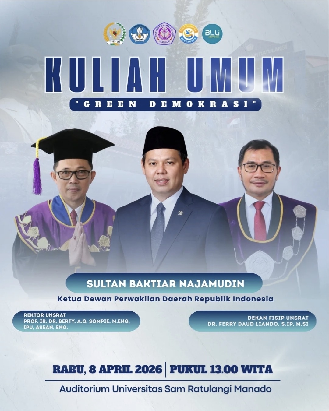 “Saya tahu Pak Ketua DPD RI sangat serius mengampanyekan Green Democracy, sehingga kami mengundang beliau untuk membahas itu,” ujar Dekan FISIP Unsrat, Dr. Ferry Daud Liando, saat menjelaskan alasan pengundangan Sultan Baktiar Najamudin.