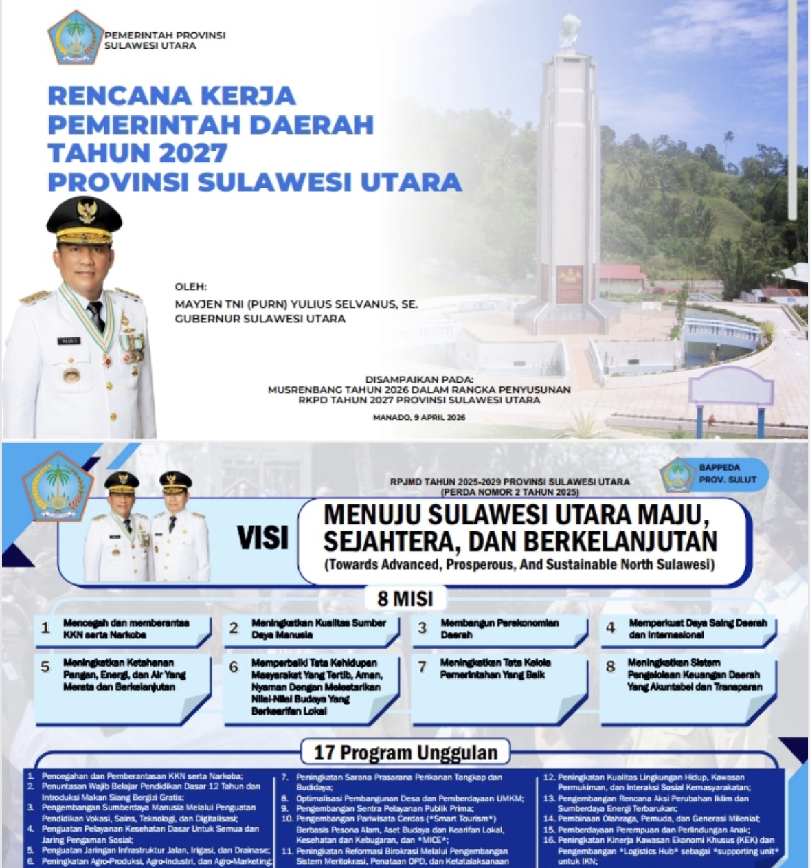 Edisibacirita – Aura Aula Mapalus Kantor Gubernur Sulawesi Utara tampak berbeda pada Kamis (09/04/2026). Musyawarah Perencanaan Pembangunan (Musrenbang) tingkat provinsi tahun ini bukan sekadar agenda seremoni. Kehadiran tokoh-tokoh kunci dari Jakarta memberikan sinyal kuat bahwa Sulawesi Utara sedang bersiap melakukan lompatan besar di bawah kepemimpinan Gubernur Mayjen TNI (Purn) Yulius Selvanus SE.