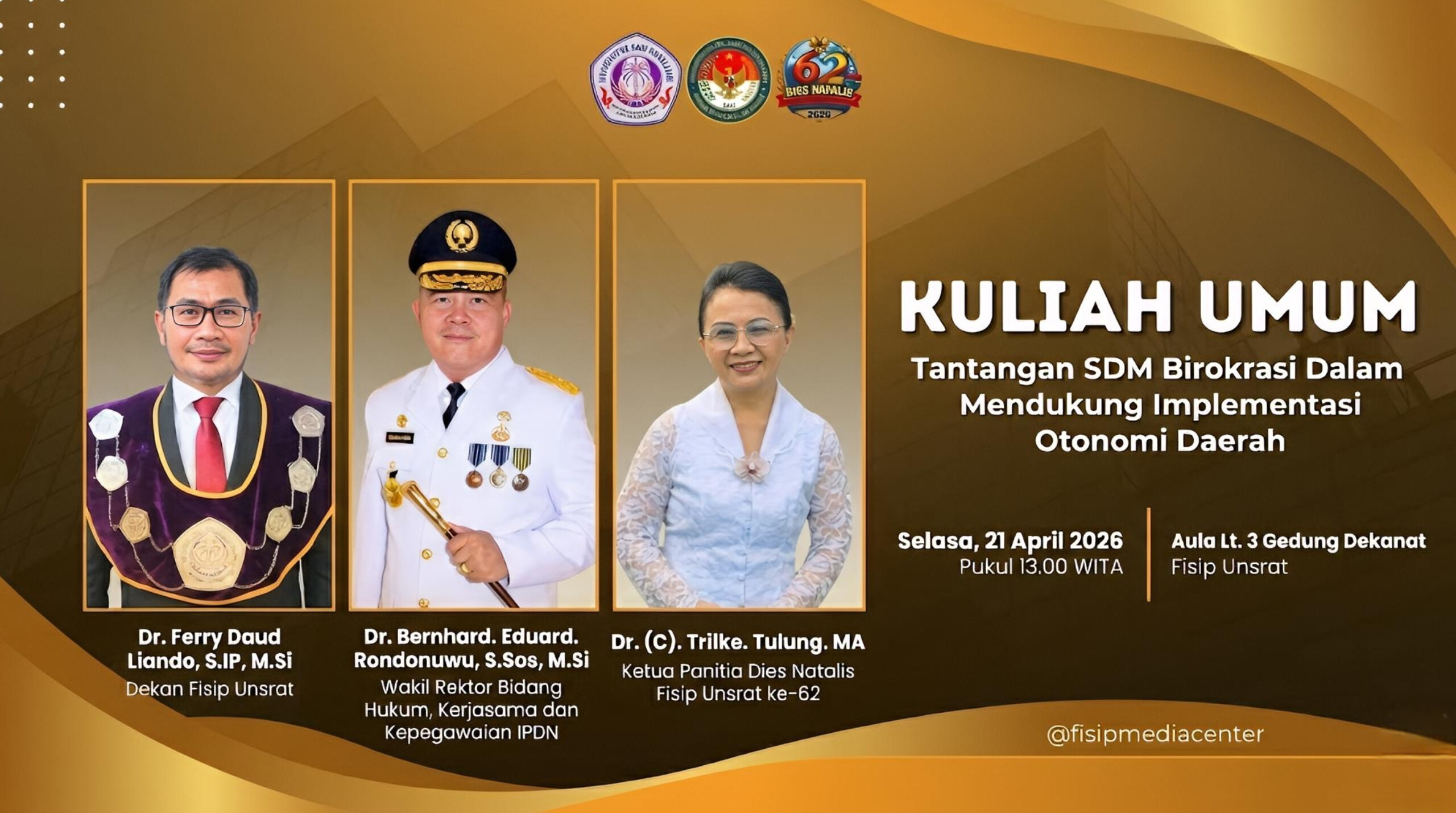 Dalam sambutannya, Dekan FISIP Unsrat, Ferry Daud Liando, menilai bahwa sejumlah kebijakan yang sebelumnya menjadi kewenangan pemerintah daerah kini mulai kembali ditarik ke pemerintah pusat. Kondisi ini dinilai menyimpang dari semangat awal otonomi daerah.