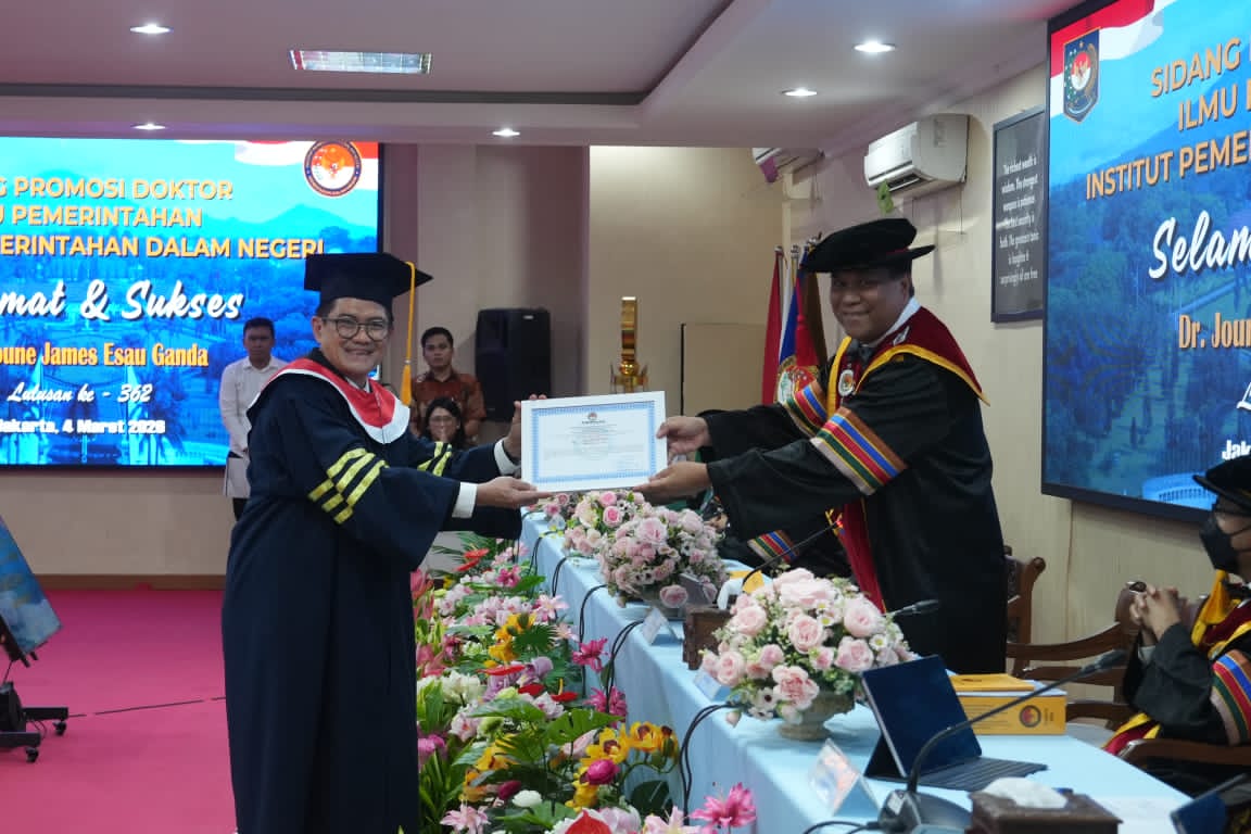 JAKARTA – Bupati Minahasa Utara, Joune James Esau Ganda, sukses meraih gelar Doktor Ilmu Pemerintahan dari Institut Pemerintahan Dalam Negeri (IPDN) Jakarta, Rabu (4/3/2026).