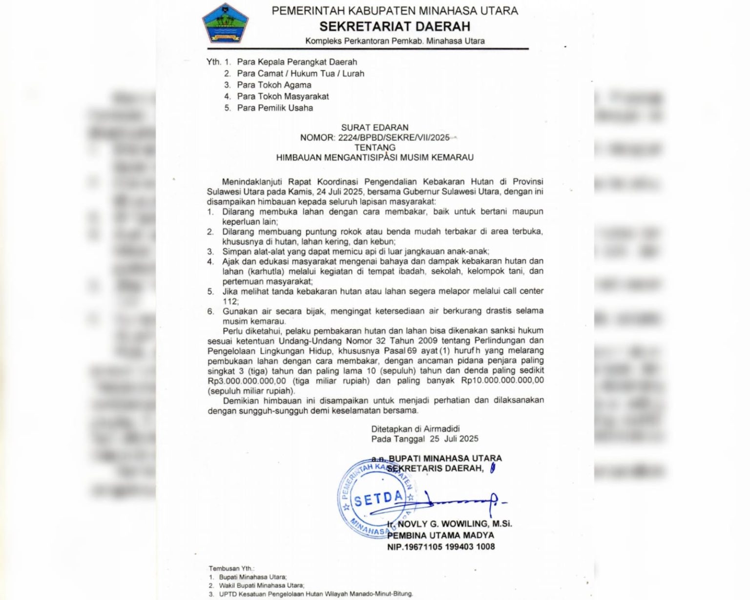 MINAHASA UTARA – Bupati Minahasa Utara Joune Ganda melalui Sekretaris Daerah Novly Wowiling resmi mengeluarkan Surat Edaran Nomor: 2224/BPBD/SEKRE/VII/2025 tentang Himbauan Mengantisipasi Musim Kemarau.
