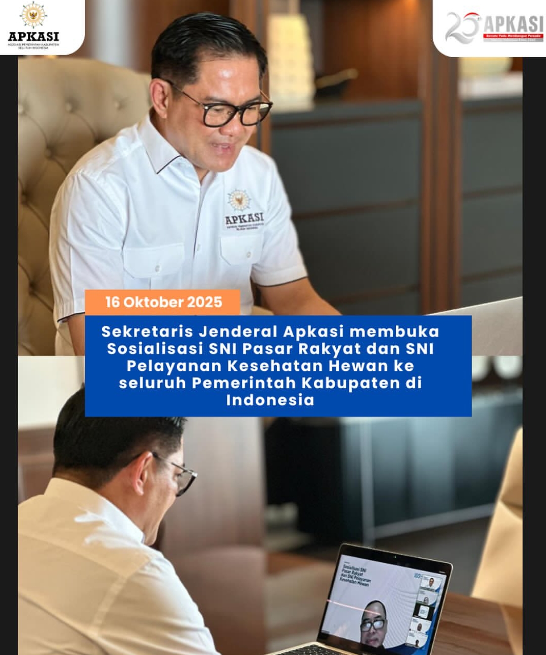 Edisibacirita – Sekretaris Jenderal Asosiasi Pemerintah Kabupaten Seluruh Indonesia (Apkasi), Joune J.E. Ganda, membuka kegiatan Sosialisasi Standar Nasional Indonesia (SNI) untuk Pasar Rakyat dan Pelayanan Kesehatan Hewan, yang digelar secara daring pada Rabu (16/10/2025).
